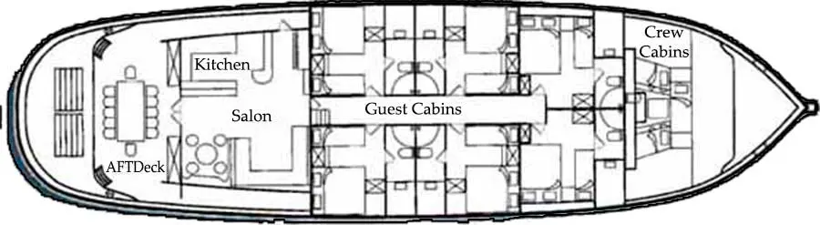 The eight luxury staterooms beautifully finished throughout in rubbed effect mahogany, fully air – conditioned, large private ensuite bathroom, radio/CD player, safebox and adequate drawer storage. Your professional crew will see that you well cared for. Gracious hospitality and a desire to make your trip unforgettable, is a Matina with this crew.